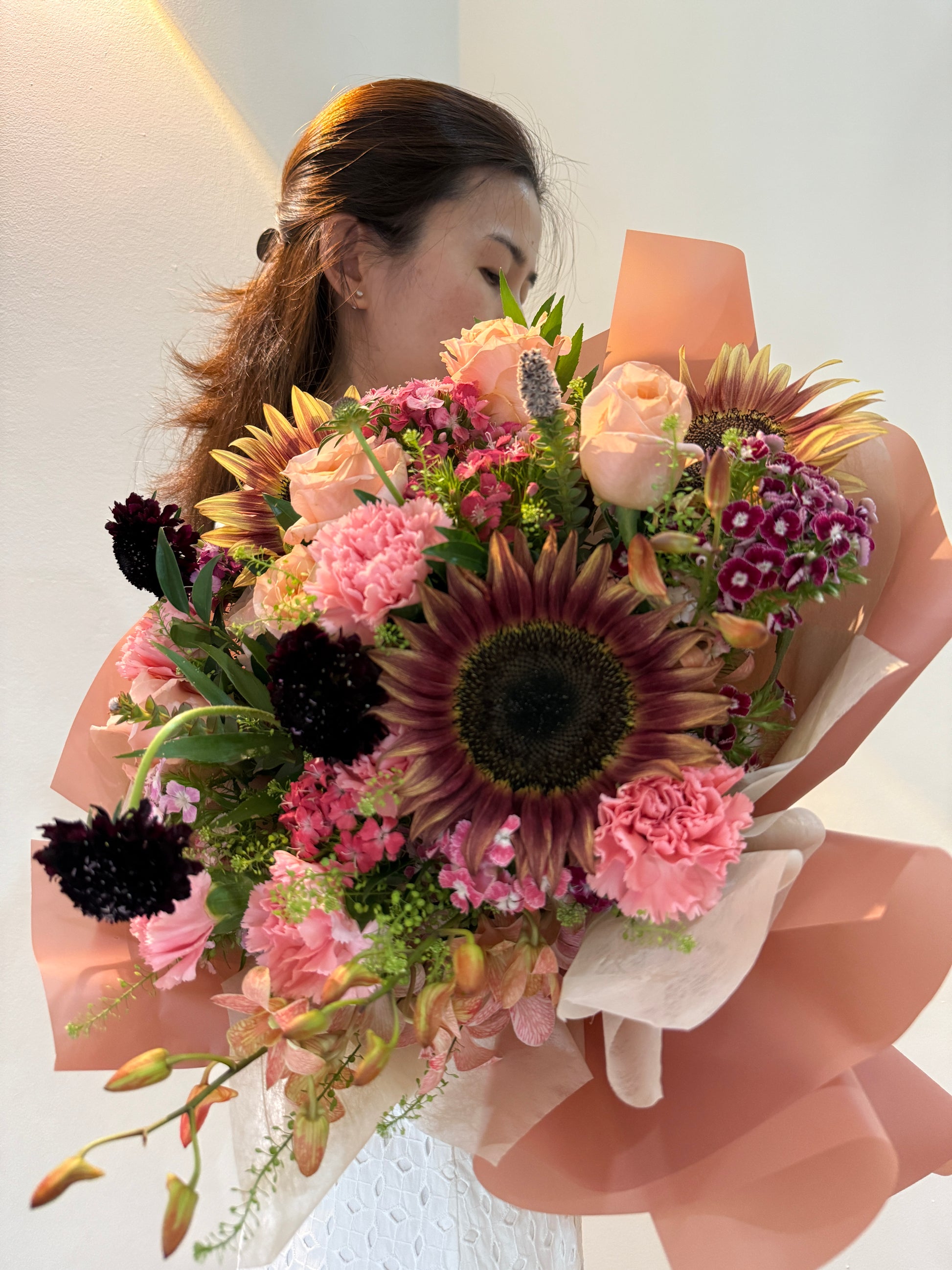 A breathtaking display of grandeur and grace with classic roses, ruffled carnations, delicate spray blooms, and airy wildflowers surround a striking central sunflower, drawing the eye with its bold form. Accents of textural fillers add movement and depth, while wisps of foliage and structural blooms create a balanced, sculptural silhouette. Aurora captures the spirit of dawn — radiant, hopeful, and alive with colour.