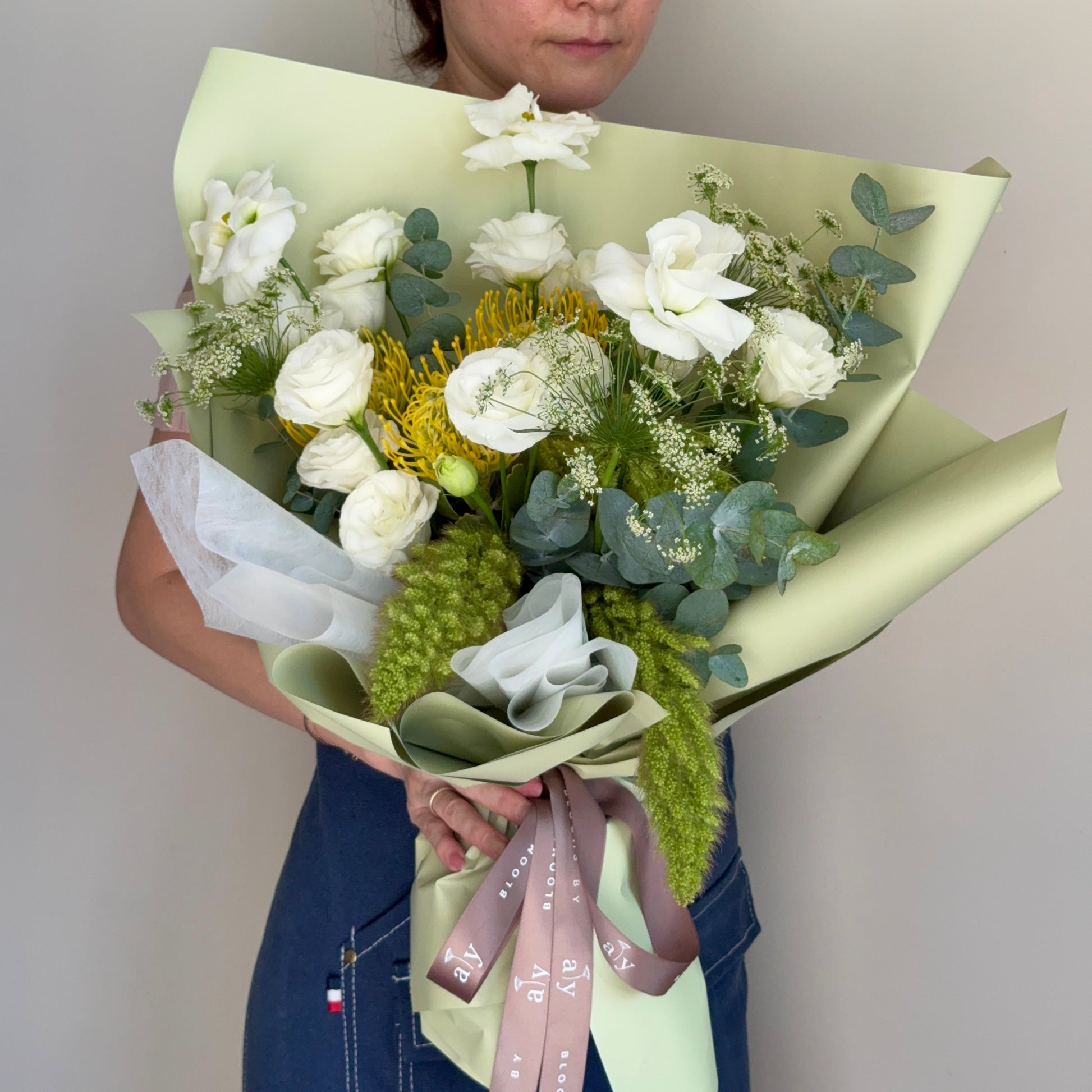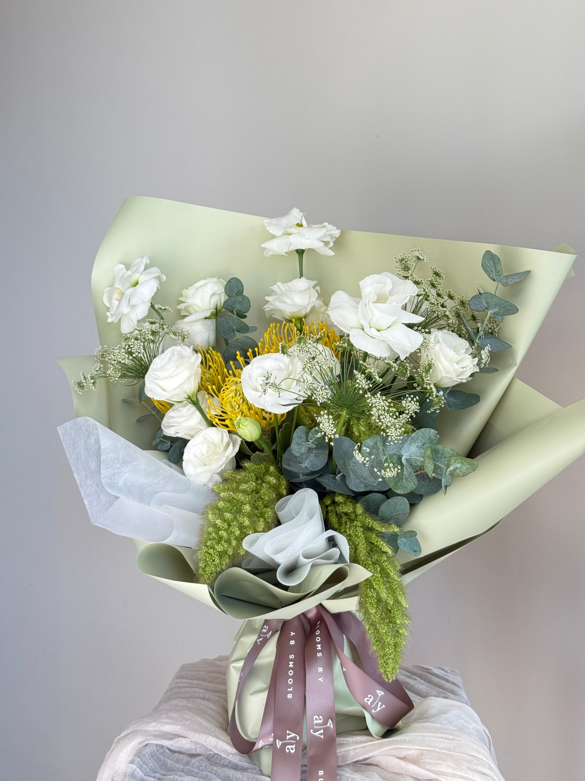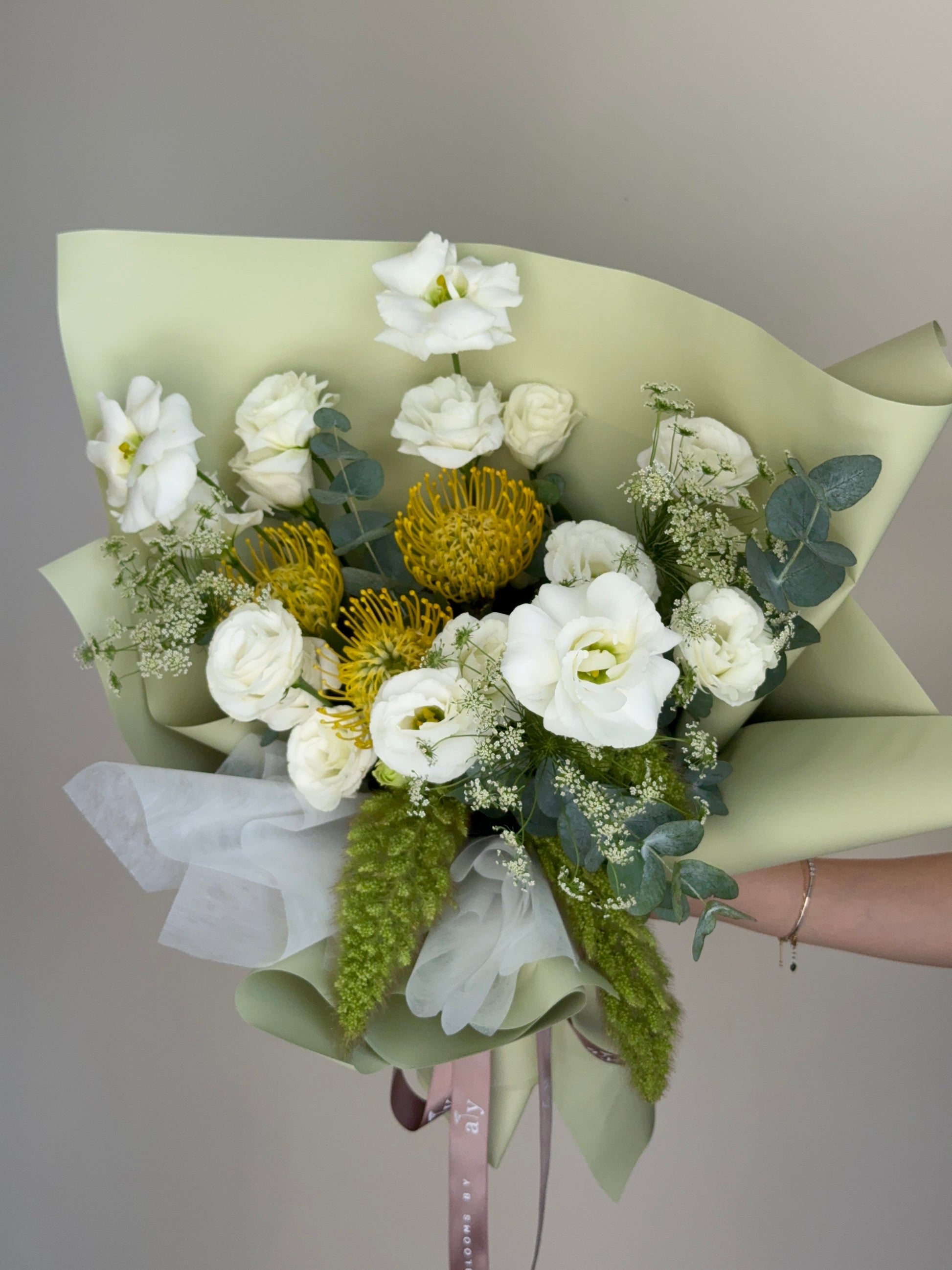 A refreshing burst of elegance, this bouquet pairs crisp white blooms with a pop of sunny yellow for a look that’s both modern and uplifting. Featuring delicate lisianthus, striking pincushion protea, and soft fillers, it’s beautifully wrapped in sage tones for a natural yet refined finish. Perfect for birthdays, celebrations, or simply to brighten someone’s day with warmth and cheer.