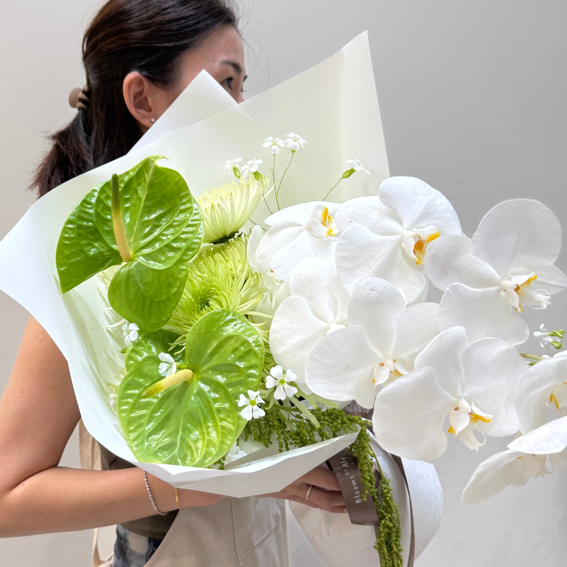 This chic arrangement pairs striking white phalaenopsis orchids and green anthuriums with soft green spider chrysanthemums and delicate white filler blooms. The contrasting shapes and textures bring a modern, artistic feel—ideal for contemporary homes or stylish gifting.
