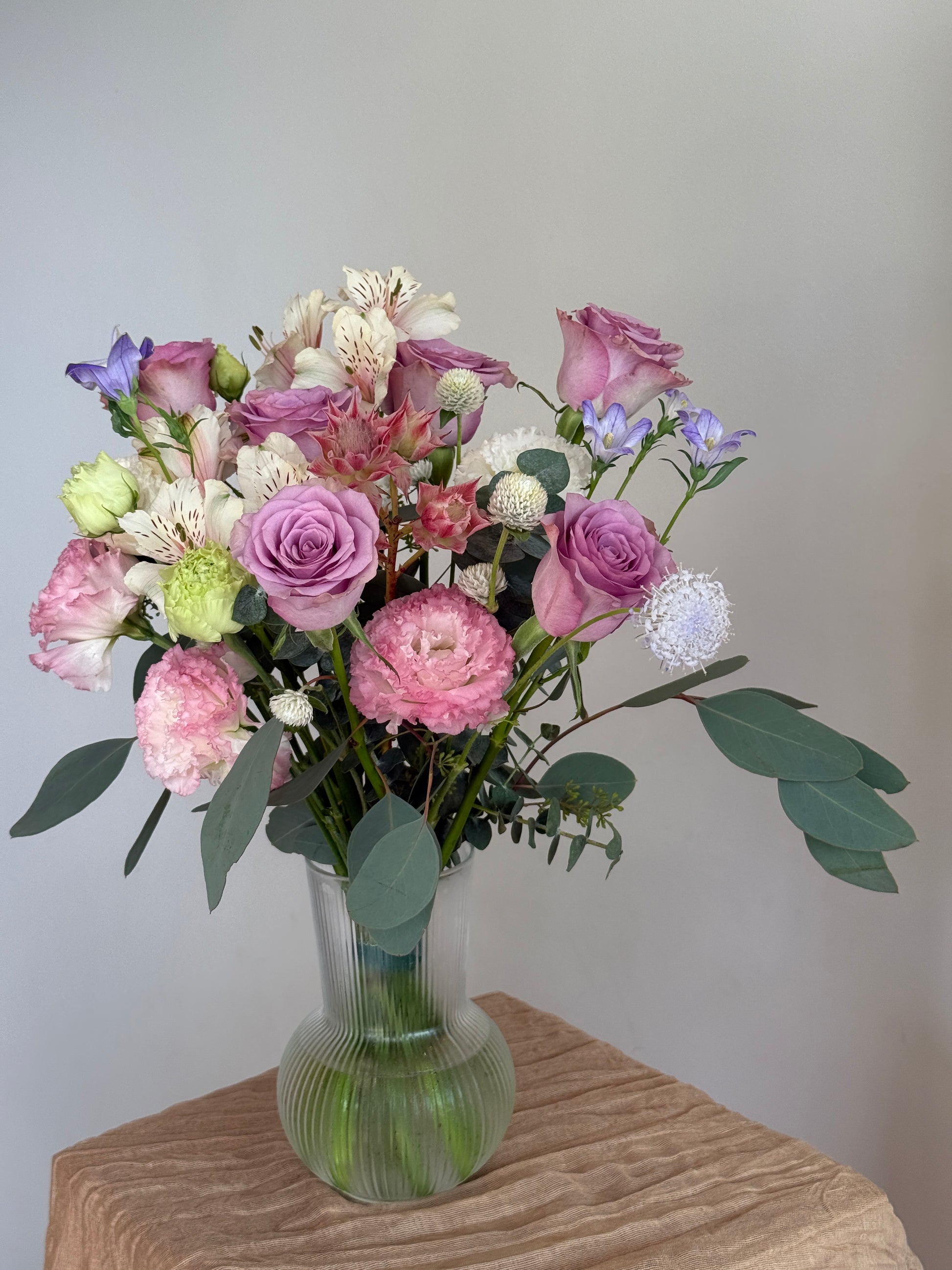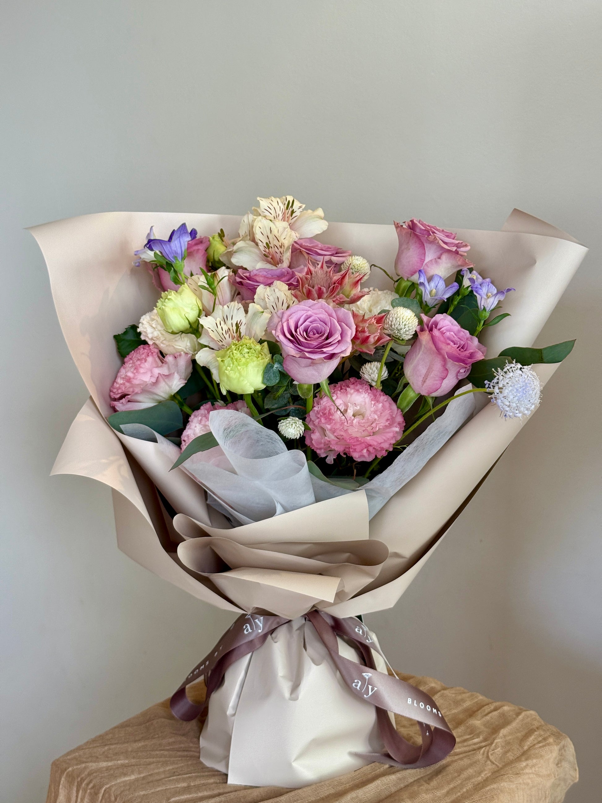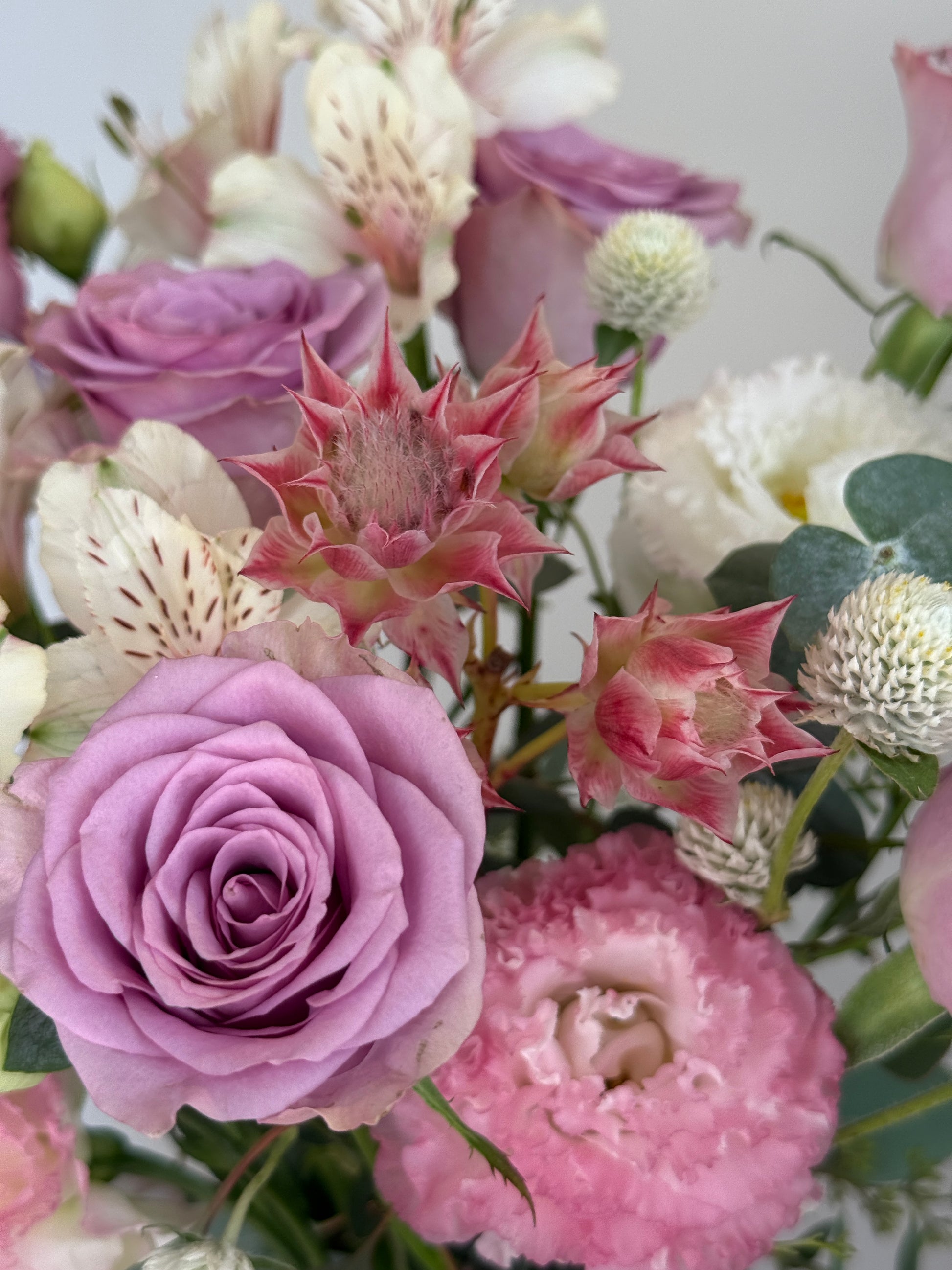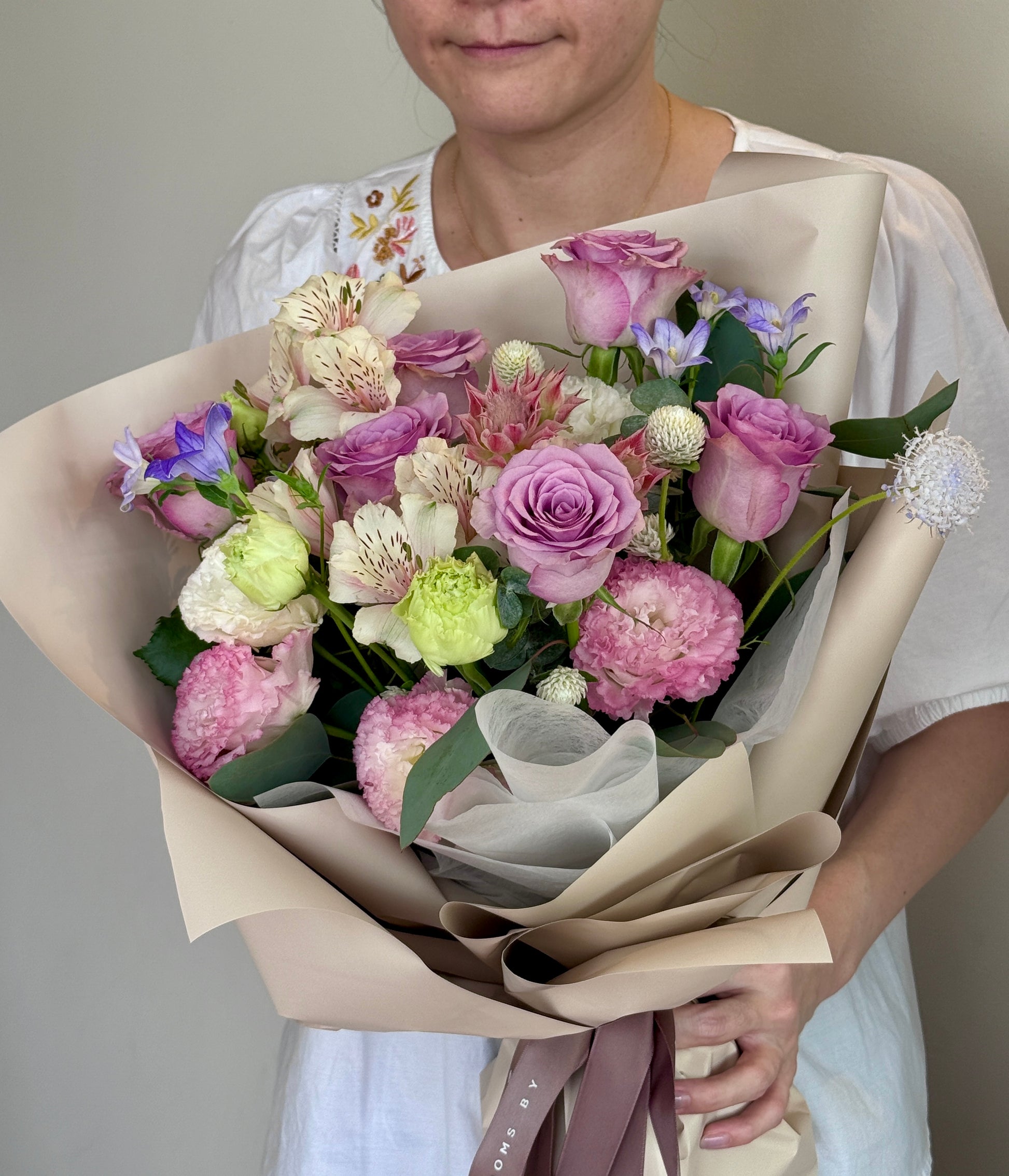 Delicate and elegant, this bouquet celebrates the timeless charm of lilac roses — the centerpiece chosen for their beauty and meaning of enchantment and admiration. Accented with soft pastel blooms in blush pink, creamy white, and refreshing green, it’s a bouquet that radiates grace and joy.