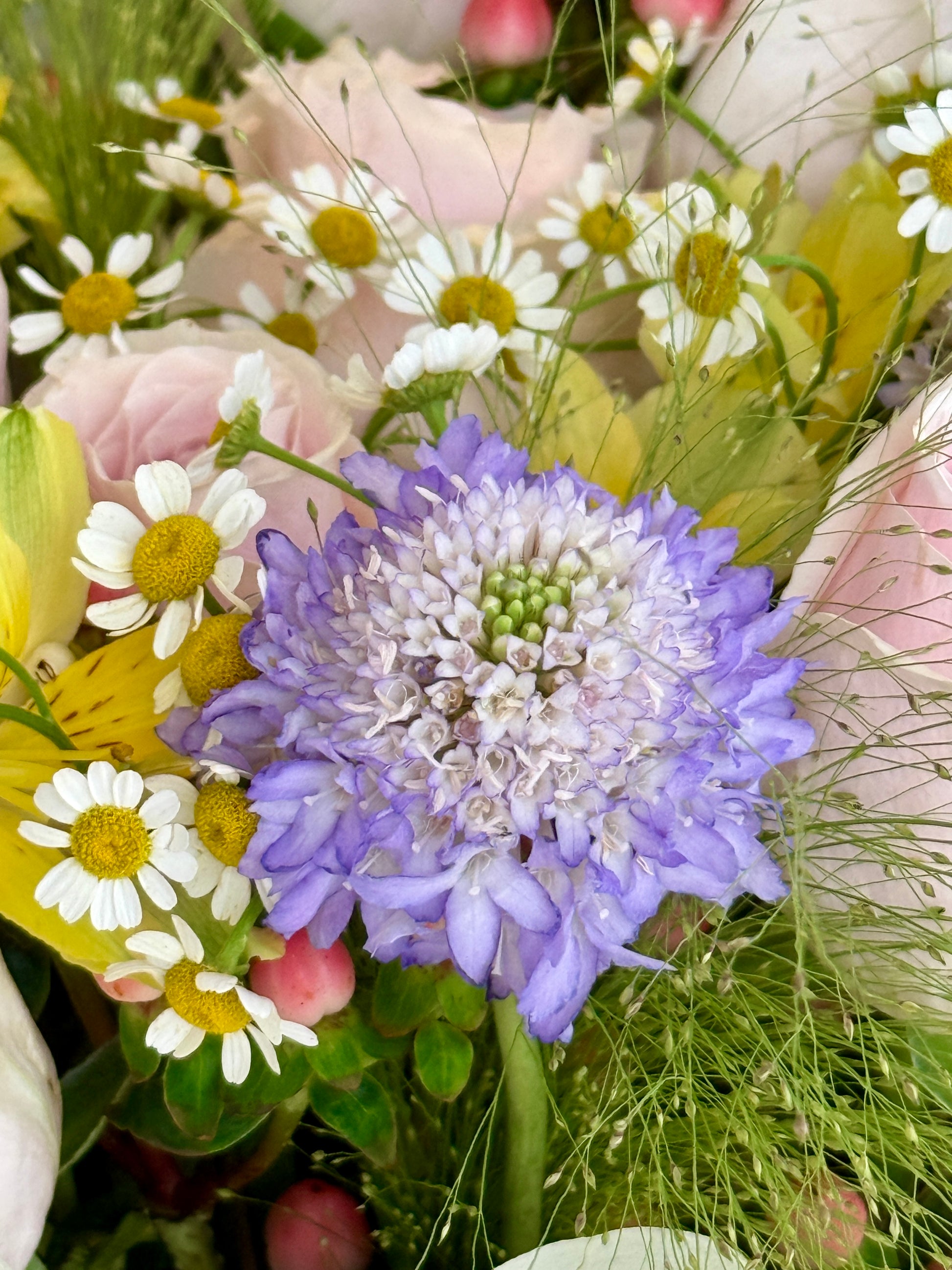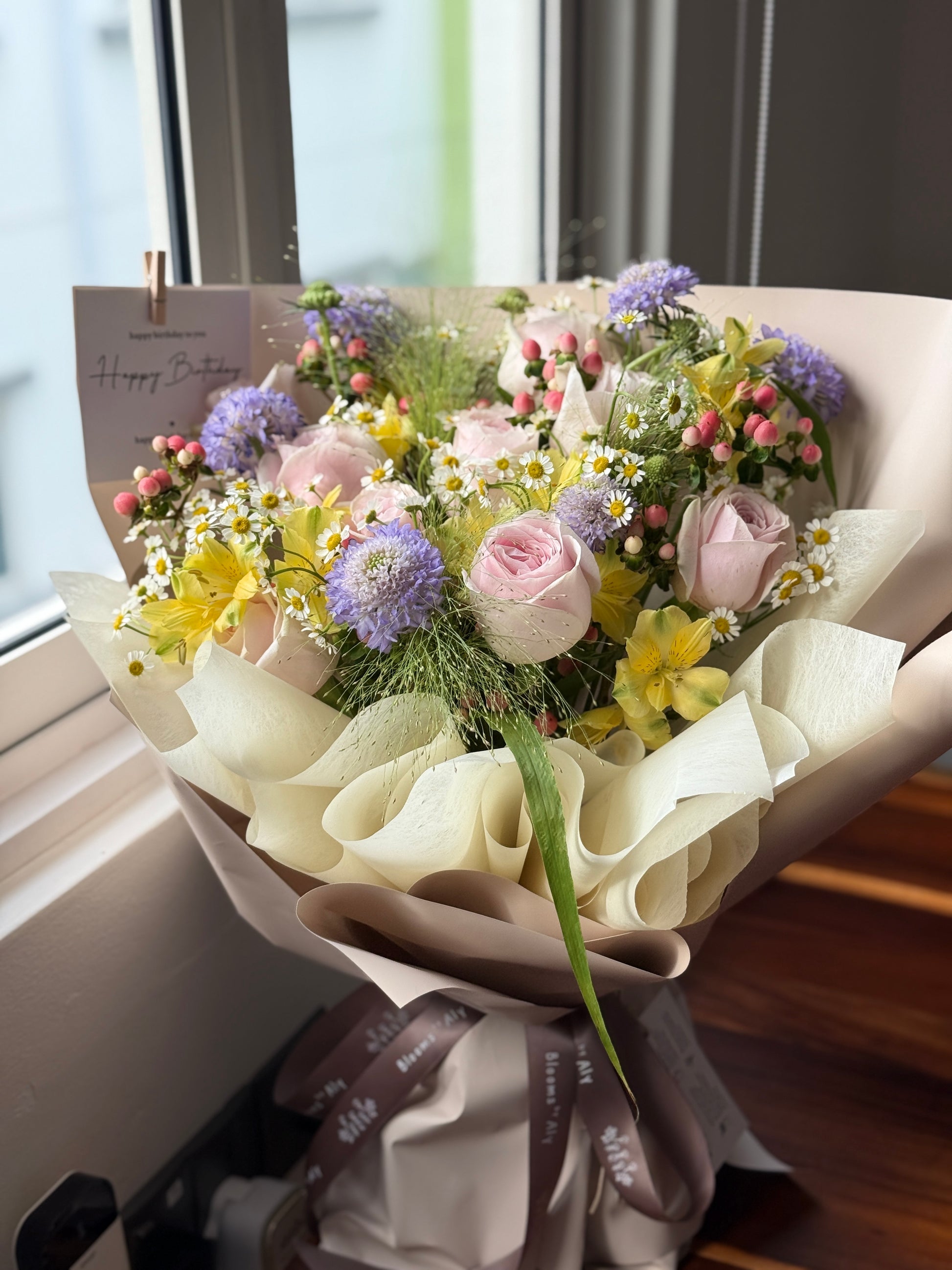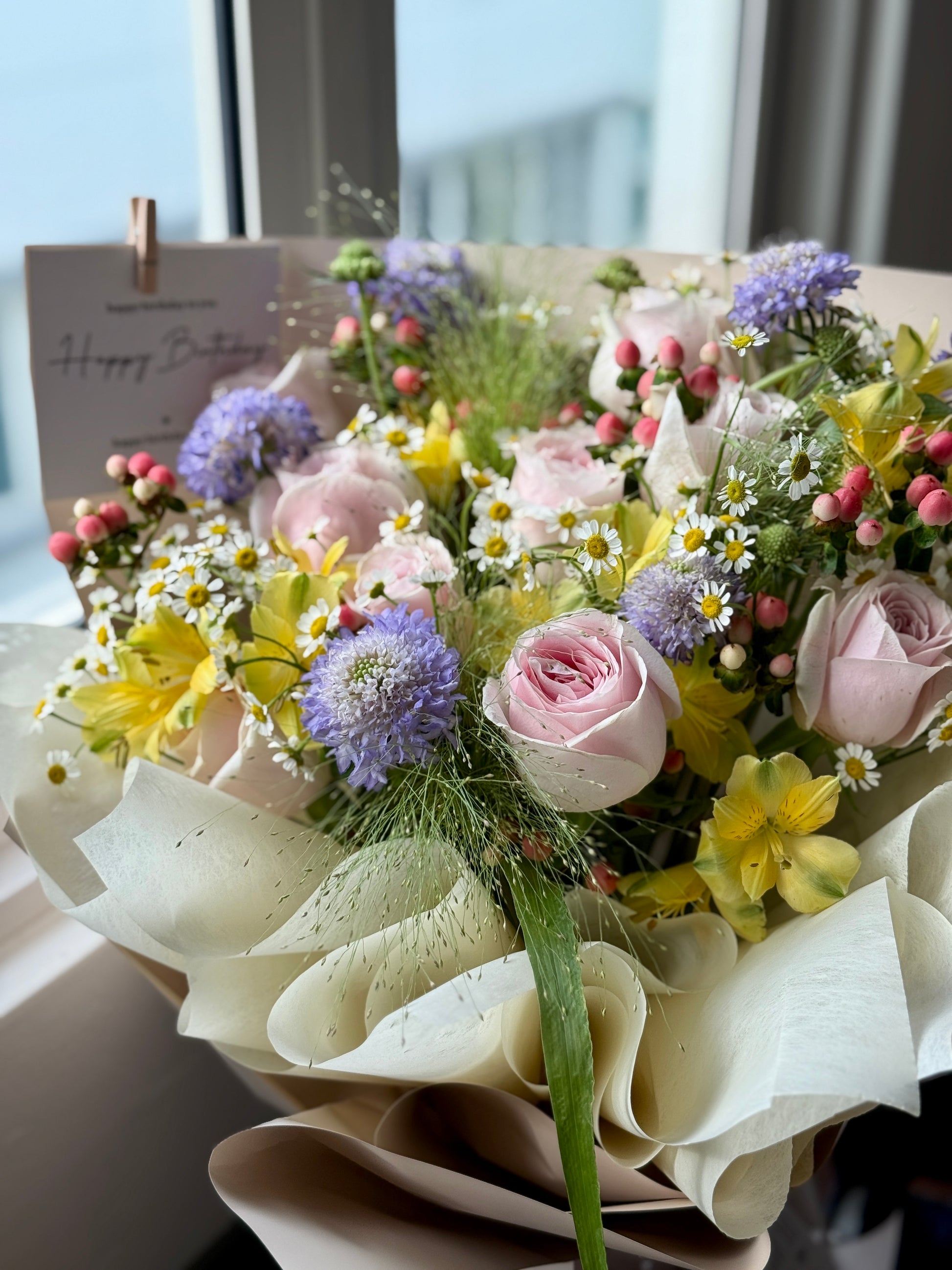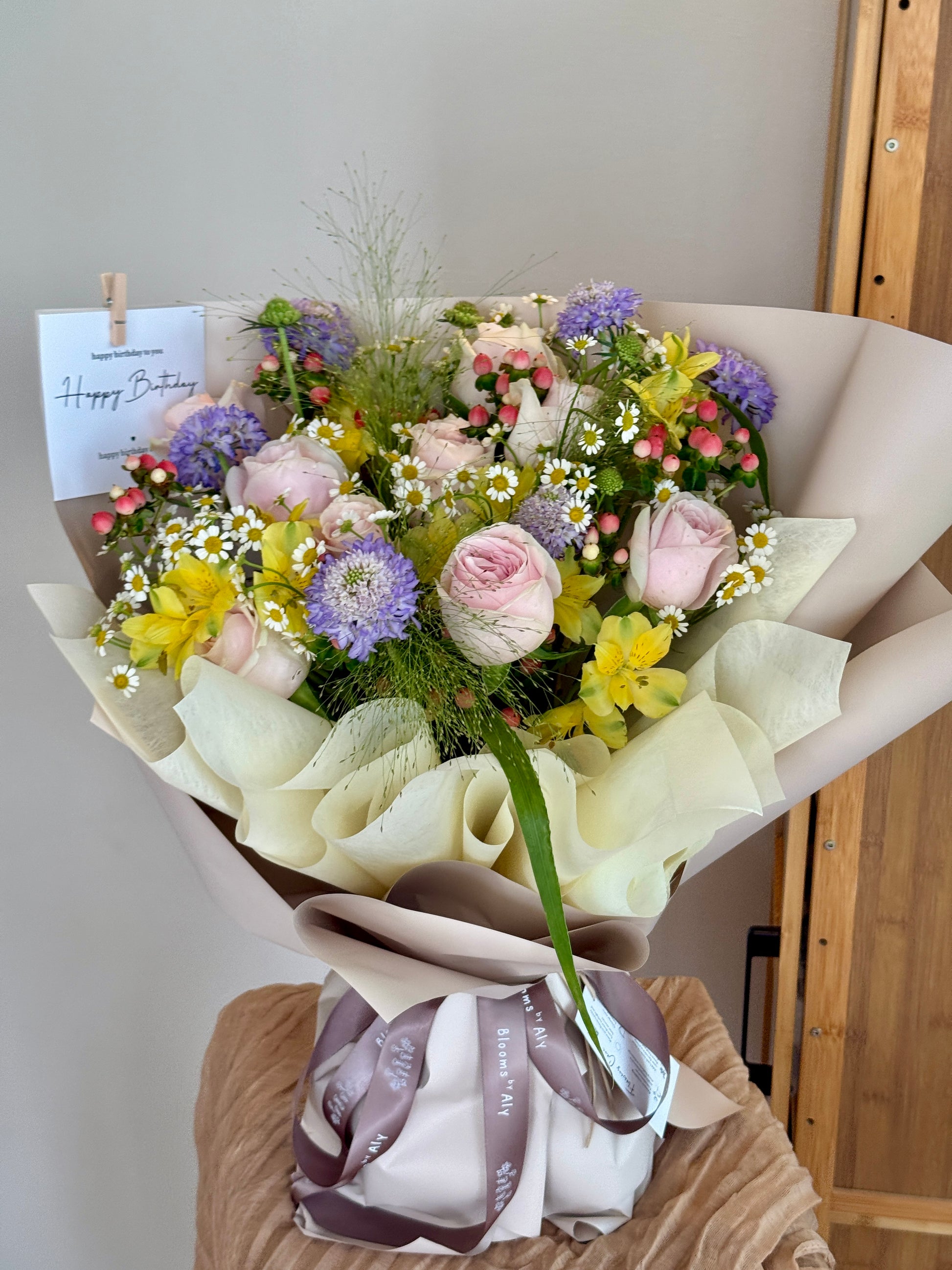 Bursting with pastel blooms, this joyful arrangement features light pink roses, yellow alstroemeria, chamomile daisies, and purple globe thistles. Wrapped in soft neutral paper, it captures the essence of a spring meadow, radiating happiness and warmth for birthdays and special celebrations.