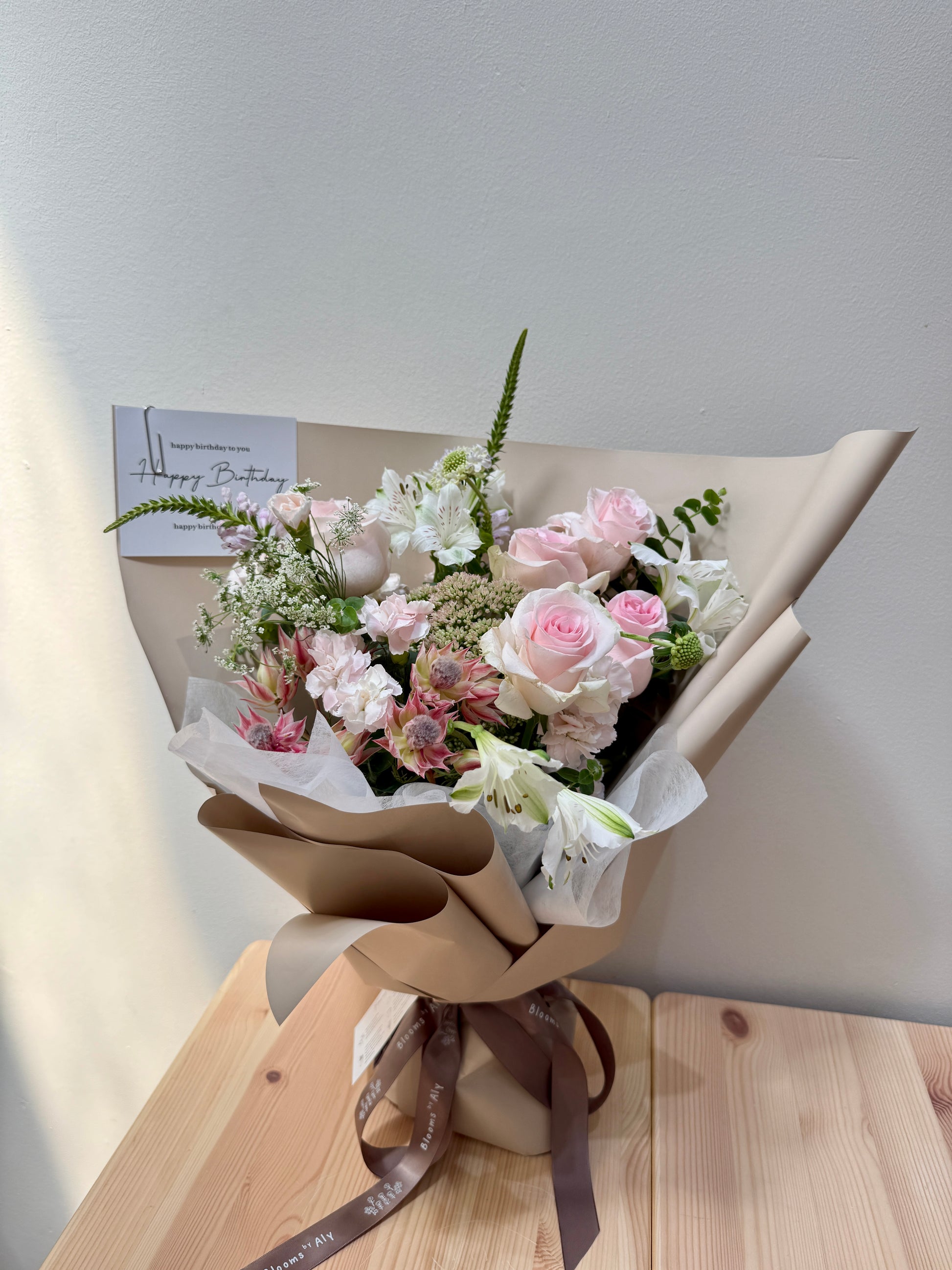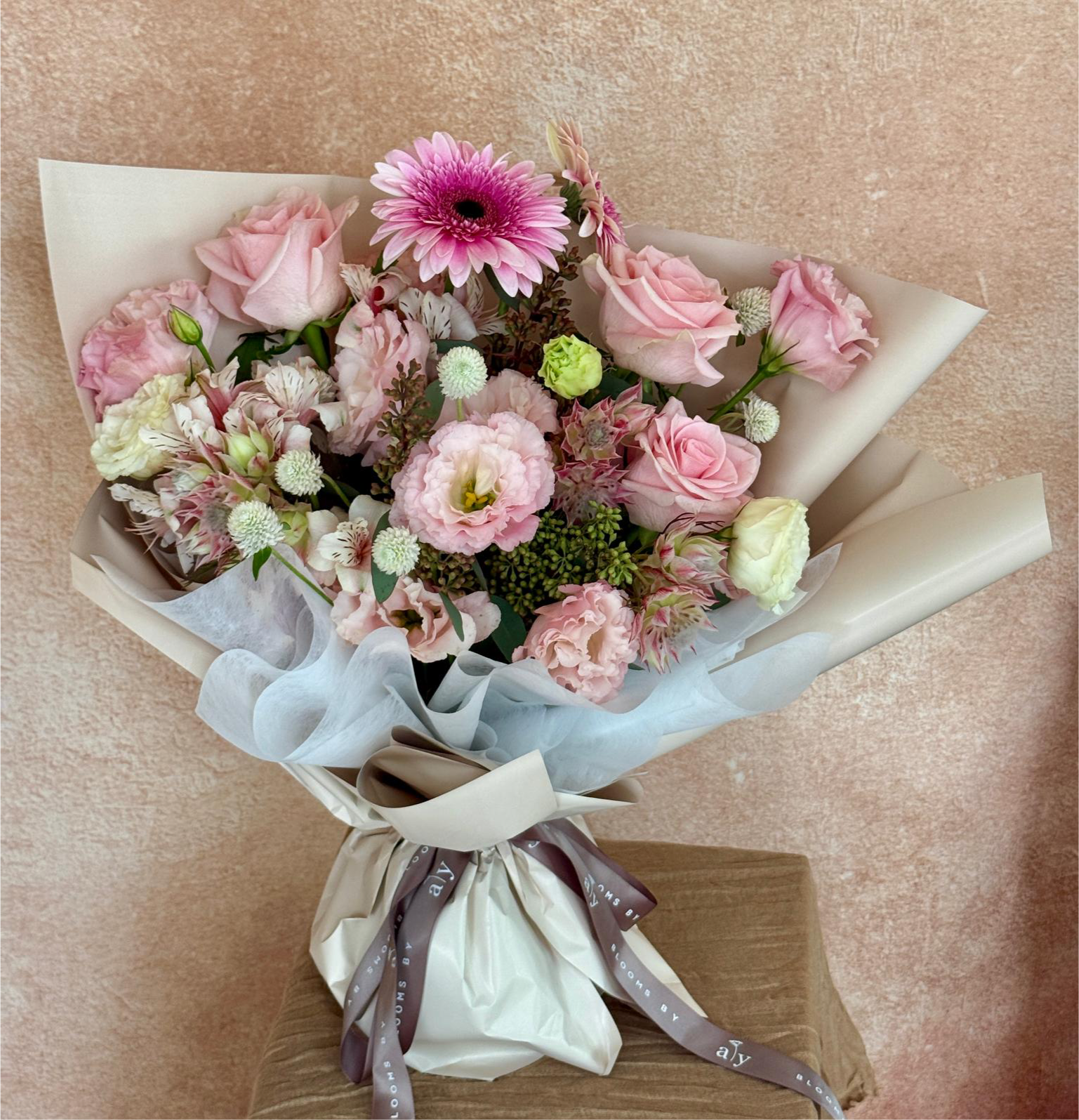 A delicate blend of pink roses, alstroemeria, lisianthus and gerbera radiates warmth softness. bouquet. The gentle hues evoke a sense of grace and timeless beauty, perfect for expressing tender affection, heartfelt sentiments, apologies, birthdays or simply sending love and comfort.