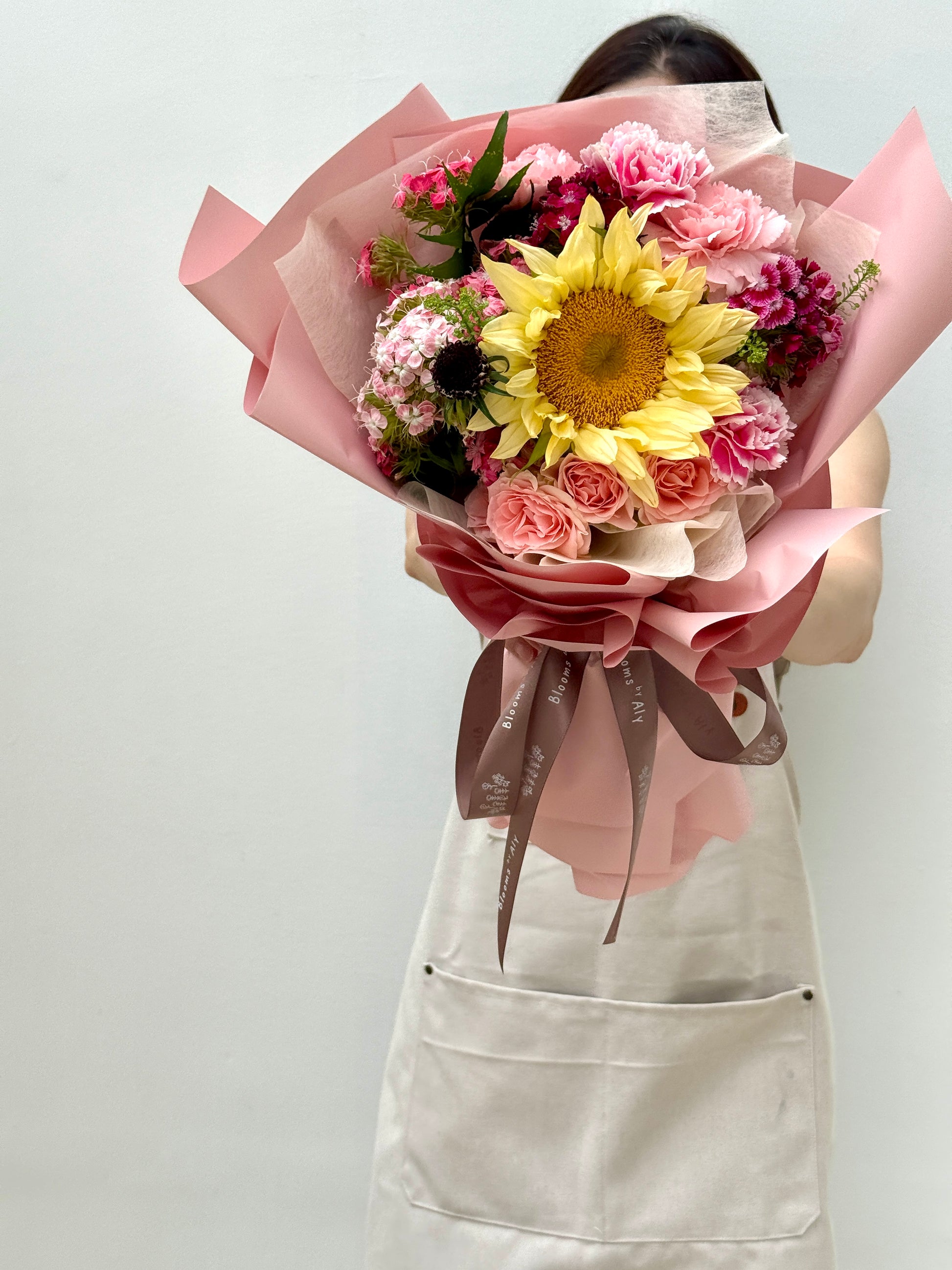 Featuring a luminous sunflower symbolizing success and optimism, this bouquet is beautifully complemented by soft pink carnations, blush roses, and seasonal blooms in shades of pink and plum. Elegantly wrapped in pastel pink with a satin ribbon, it’s the perfect gift to mark this proud moment and inspire new beginnings or simply brighten one’s day.